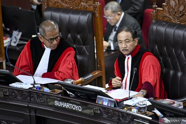 Ketua Mahkamah Konstitusi (MK) Suhartoyo (kanan) bersama Wakil Ketua MK Saldi Isra memimpin sidang pengucapan putusan perkara dilanjutkan atau tidak (dismissal) sengketa Pilkada 2024 di Gedung Mahkamah Konstitusi, Jakarta, Rabu (5/2/2025). (ANTARA)