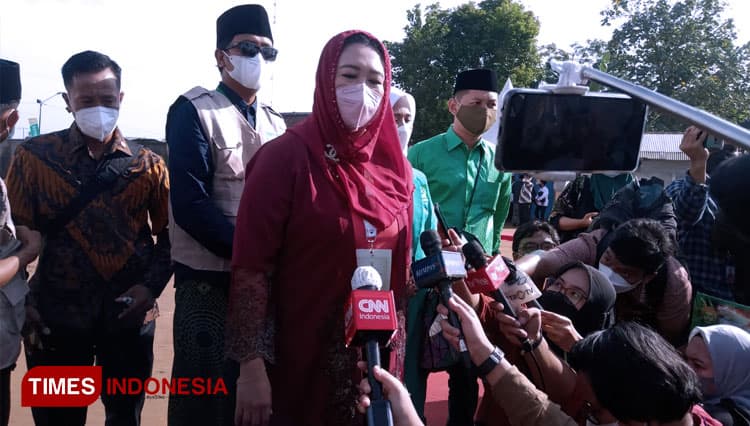 Putri Abdurrahman Wahid (Gus Dur) Yeny Wahid saat diwawancarai oleh awak media. (FOTO: Moh Ramli/TIMES Indonesia)